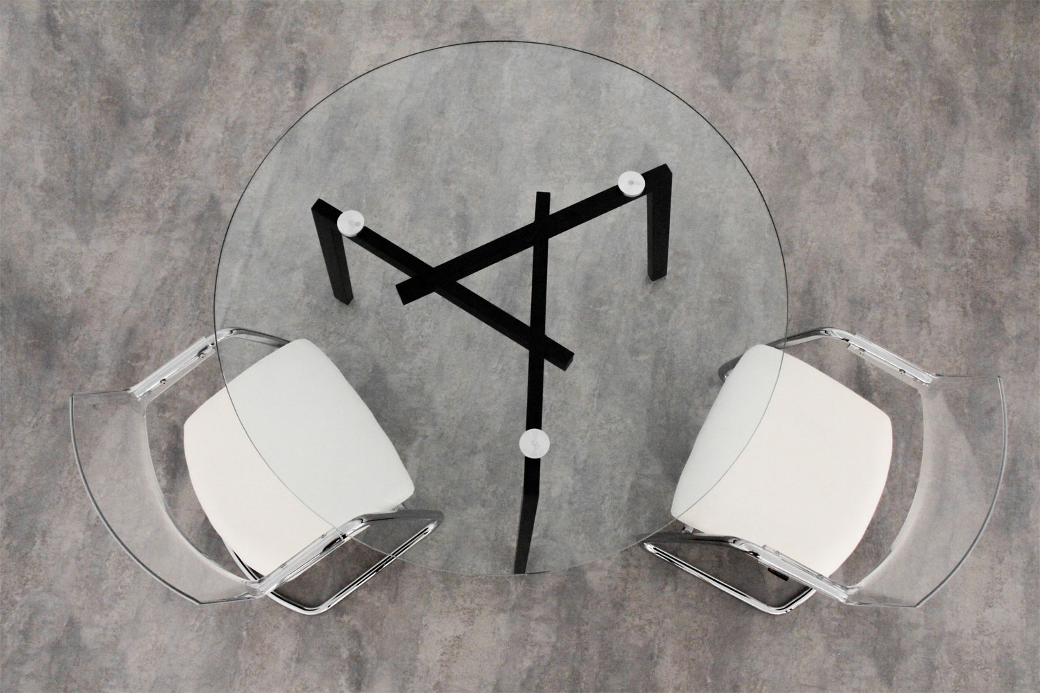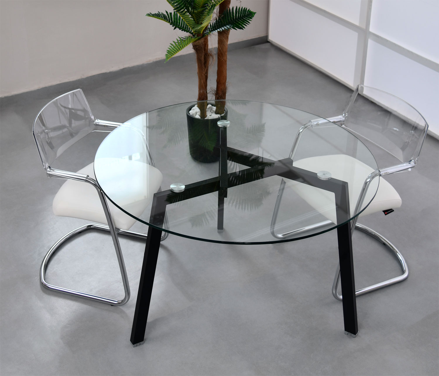 Elle est composée d’un plateau en verre clair de diamètre 1,20 m et d’épaisseur 12 mm, apportant légèreté visuelle et modernité.