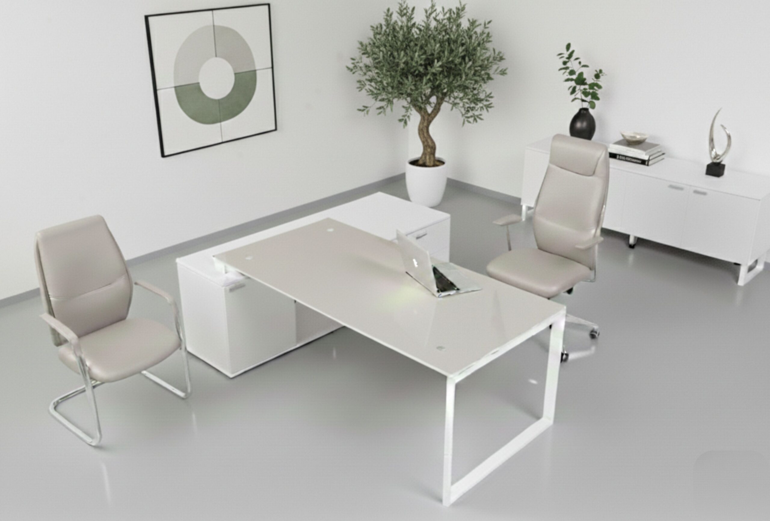 Élégant et fonctionnel, le bureau SEVEN séduit par son plateau en verre et son design structuré.