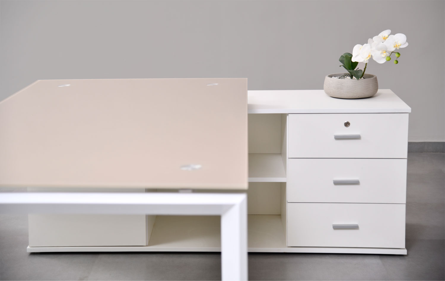 Il est composé d’un plateau principal en verre émaillé (1,80 x 0,90 m, épaisseur 12 mm), reposant sur un meuble retour SEVEN (1,60 x 0,50 m) intégrant 3 tiroirs, 1 niche avec étagère et 1 porte pour un rangement optimisé.